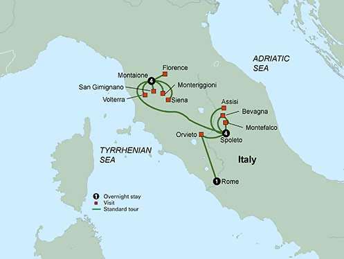 See another side of Italy. Explore Tuscany and Umbria’s smaller, more authentic towns. Learn the secrets of Tuscan and Umbrian cuisine. Journey to Florence, the “Cradle of the Italian Renaissance.” Visit a family owned winery for a tasting and have a home-hosted lunch in a charming country home. Stop in Siena, a medieval town with one of Tuscany’s most beautiful squares. Travel to the Etruscan hill town of Orvieto, known for its white wine and Gothic cathedral. Along the way, savor regional specialties and enjoy Italian wines with every dinner.