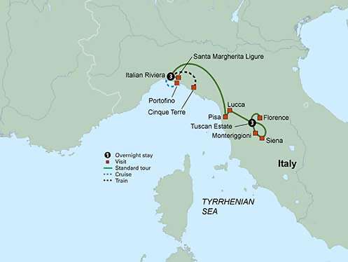 Join us as we travel across the Italian countryside, over the rolling hills of Tuscany and to the enchanting Italian Riviera. Relax with a three-night stay in a Tuscan estate and savor the sprawling vineyards and charming medieval hill towns of the region. Enjoy a private winery tour on an interactive pasta-making demonstration. Spend a day exploring the Cinque Terre’s rugged coastline by train. Visit the Uffizi Gallery and marvel at some of the Renaissance’s most important works. Visit Siena, Pisa, and Lucca. Take a boat ride from Santa Margherita Ligure to visit glamorous Portofino. Revel in a three-night stay on the stunning Riviera. Stroll along the streets of the walled town of Monteriggioni and take a guided tour of the treasures of Florence. Throughout your journey, discover a land rich in history, culture and cuisine.