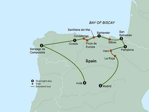 Journey to Northern Spain, and explore seven provinces filled with spectacular beauty, works of art, unique culture and delicious cuisine. In Madrid, marvel at the priceless masterpieces of the Prado Museum, housing one of the world’s finest art collections. Stop for a tour and tasting at one of La Rioja’s great historic wine cellars. Overnight in Pamplona, known worldwide for its annual running of the bulls. Savor San Sebastián’s famous culinary creation, pintxos, during a two-night stay. Be amazed at the architecture and art collection of Bilbao’s Guggenheim Museum. Visit Santillana del Mar, considered to be the most beautiful village in Spain. On Oviedo’s “boulevard cider,” see how the locals pour their famous sweet liquid from great heights. Spend two nights in the pilgrim city of Santiago de Compostela. Stay inside the 11th-century walls of Avila, known as the “city of stones and saints.”