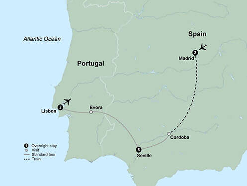 Delve into three grand cities of the Iberian Peninsula, each filled with unique treasures to uncover. Spend time exploring Madrid, Seville and Lisbon with multiple nights in each. In Madrid, a local expert leads you though the priceless masterpieces of the Prado Museum. Take a journey on the thrilling AVE High Speed Train. Explore the monumental compound of the Royal Alcázar of Seville. Walk the winding narrow streets and quaint courtyards of Barrio Santa Cruz, in Seville. Converse with a flamenco dancer during a “tapas lunch.” Then, be treated to reserved seats at a flamenco show. Discover Evora, Portugal, the “Museum City of Portugal.” In Lisbon, see one of the world’s finest art collections at the Calouste Gulbenkian Museum. Explore Lisbon your way when you choose between an expertly guided panoramic city tour and a walking tour of the Alfama District. Marvel at five centuries of Portuguese decorative ceramic tiles (azulejos). From beginning to end, you will have plenty of time to explore, get to know the charms and savor the atmosphere of each of these magnificent cities.